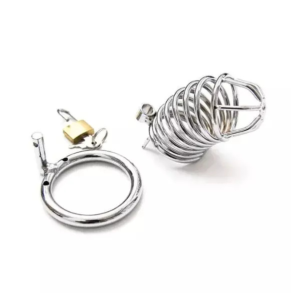 Cinto de castidade masculino em formato de gaiola em aço, possui argola para o escroto e abertura vazada.