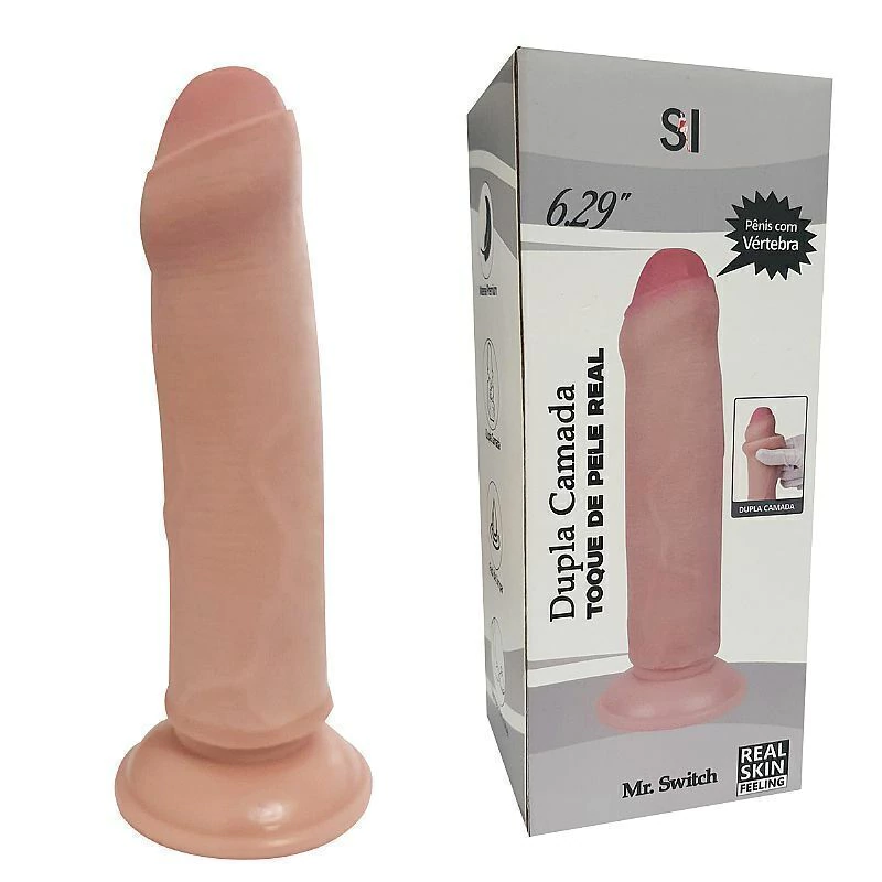 Prótese realística em formato de pênis dupla camada, confeccionado em TPE possui glande definida, textura de veias, com ventosa para penetrações em ângulo reto. com vértebra